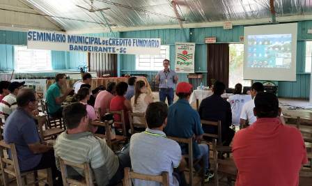 Bandeirante tem mais de 45 famílias beneficiárias do programa de crédito fundiário que recebem assistência técnica da Epagri.  O seminário contou com mais de 30 pessoas, entre famílias rurais, técnicos, representantes de entidades, autoridades municipais e regionais. O evento foi promovido pela Epagri com apoio da prefeitura, do sindicato dos trabalhadores rurais, do sindicato dos produtores rurais, do Sicoob e do Banco do Brasil.