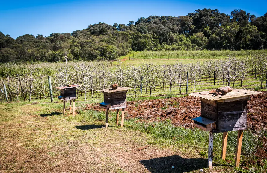 A recomendação das pesquisas é de, pelo menos, seis colmeias de abelhas com ferrão por hectare. O uso de abelhas nativas ajuda a complementar a polinização, especialmente porque essas espécies têm mais facilidade de voar sob as telas antigranizo usadas para proteger os pomares. “Usando 10 a 12 colmeias de abelhas nativas por hectare, consegue-se aumento de rendimento de até 5 toneladas de maçã por hectare em comparação a outras áreas, sem telas antigranizo e sem abelhas sem ferrão”, aponta o pesquisador.