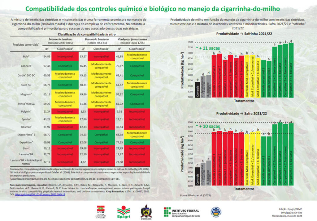 Publicações da Epagri também avaliam a eficácia de inseticidas para o controle da cigarrinha-do-milho. O Tratamento de sementes de milho para o inseto vetor, realizado em ensaios em casa-de-vegetação e em campo, mostram que imidacloprido e sua combinação com tiodicarbe apresentaram controle satisfatório nos primeiros estágios após a emergência da planta. No entanto, nenhum tratamento isolado diminuiu a incidência das doenças transmitidas pela cigarrinha nem aumentou a produtividade, mostrando que outras medidas de manejo devem ser aliadas ao tratamento de sementes. Pesquisas recentes avaliaram a eficácia de diferentes inseticidas, comparando produtos químicos e bioinseticidas de origem biológica. Os resultados mostraram que a maioria das misturas entre inseticidas e micoinseticidas (fungos entomopatogênicos) apresenta compatibilidade fisiológica, permitindo seu uso conjunto em misturas de tanque (Crop Protection 2023; Crop Protection 2025) (Figura).