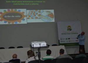 O pesquisador Rafael Ricardo Cantú apresentou a palestra técnica “Pepino para conserva: crescimento, produção e absorção dos nutrientes em cultivo protegido”. Ele mostrou os resultados das pesquisas realizadas pela EEI na área de produção, nutrição e manejo da cultura em abrigos de cultivo.