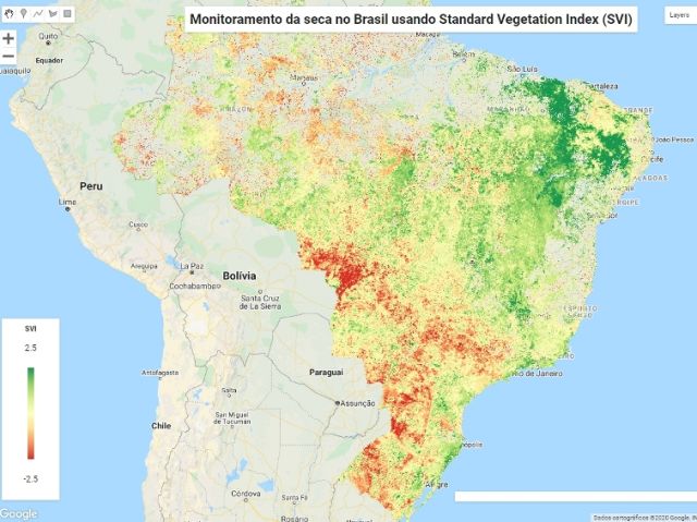 Valores baixos de SVI indicam más condições da vegetação que podem ser o resultado das condições climáticas. Já altos valores de SVI podem refletir as condições climáticas ideais para o crescimento, de modo que o verde da vegetação é mais alto do que o encontrado em na média dos outros anos. “Esse índice é como se fosse a saúde da vegetação: quanto mais verde, mais saudável ela está. Quanto mais vermelha, menos desenvolvida”, explica o pesquisador Wilian.