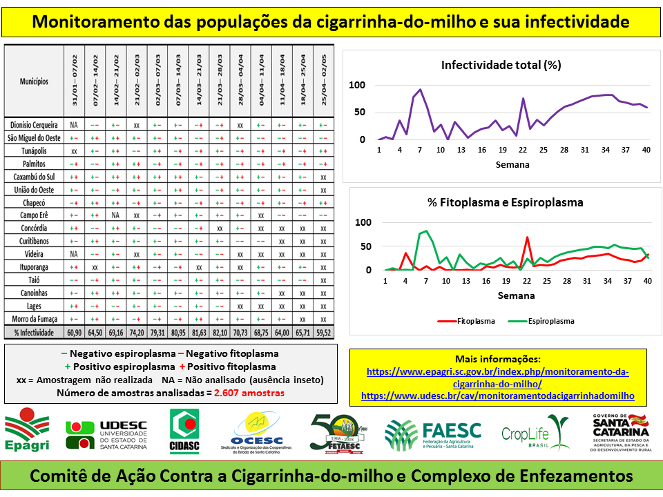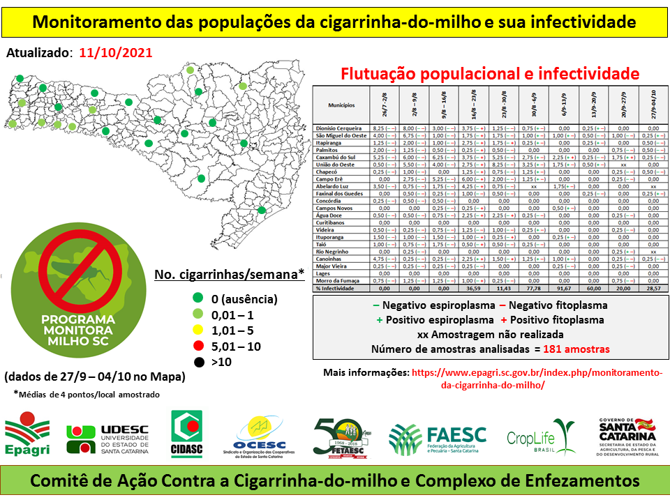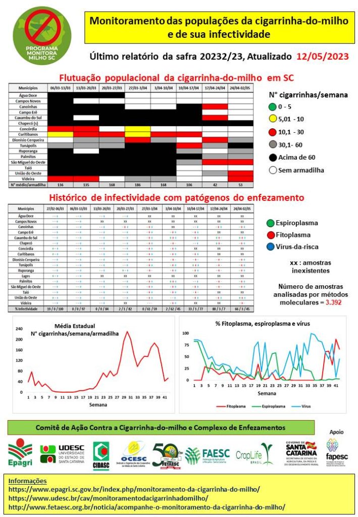 O ataque de cigarrinhas infectadas com os patógenos dos enfezamentos pode comprometer substancialmente a produção de lavouras de milho. Para acompanhar a situação, foi criado no começo de 2021 o programa Monitora Milho SC, uma iniciativa do Comitê de Ação contra Cigarrinha-do-milho e Patógenos Associados, composto pela Epagri, Udesc, Cidasc, Ocesc, Fetaesc, Faesc, CropLife Brasil e Secretaria de Estado da Agricultura e Pecuária. O Programa Monitora Milho SC se destaca como uma das principais iniciativas científicas da Epagri, conquistado reconhecimento em diversos eventos nacionais e internacionais. Sua metodologia tem servido de referência para ações similares em outros estados brasileiros e até para o exterior.