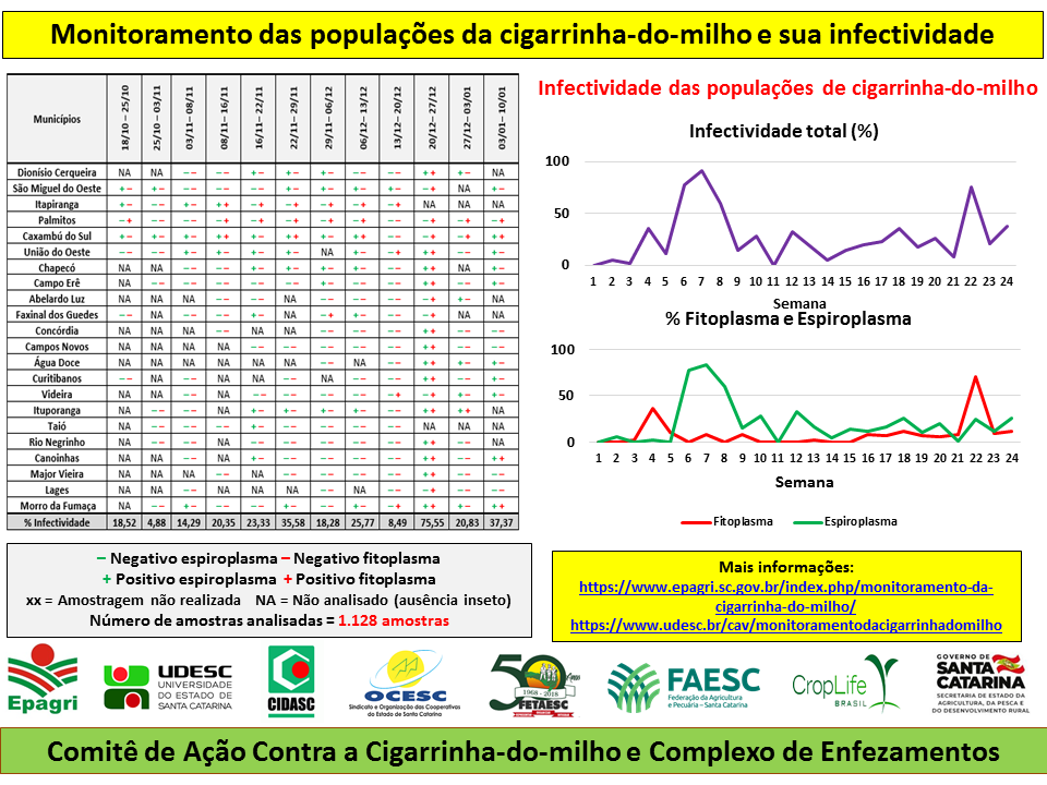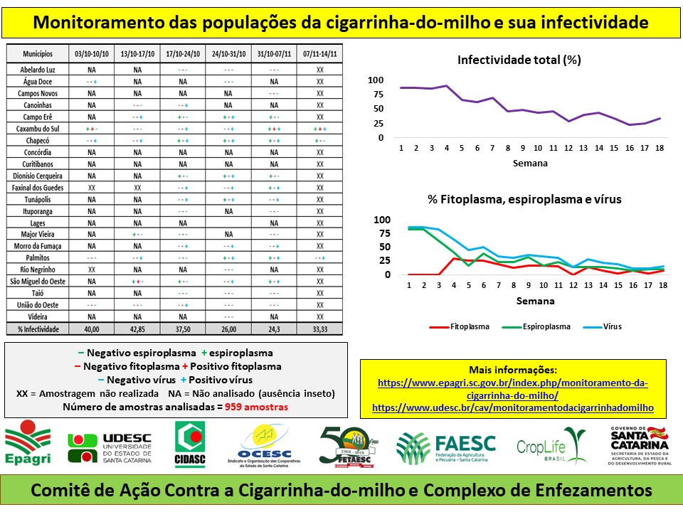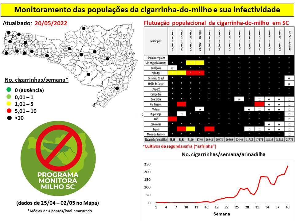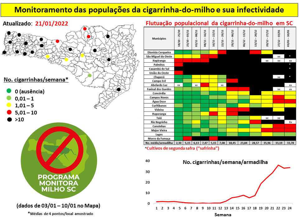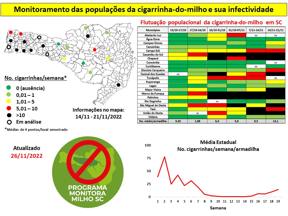 O programa Monitora Milho SC coleta e divulga semanalmente informações levantadas em 55 lavouras distribuídas em todo o Estado de Santa Catarina, permitindo que o setor produtivo acompanhe a evolução da população de cigarrinhas e as infecções causadas por esses insetos.