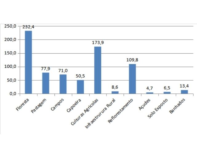A área total mapeada nessas propriedades foi de 748,35ha. “Proporcionalmente, a área correspondente à classe de florestas correspondeu a 31% da área total mapeada, com aproximadamente 232,4ha seguida pelas classes de pastagem com 77,9ha (10%) e os campos naturais com 71,0ha (9%). As classes de menor expressão identificadas no mapeamento foram açudes com 4,7ha e solo exposto com 6,5% que representam cerca de 1% do total cada” explica Everton.