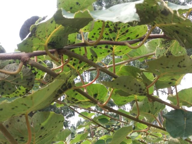 De acordo com o pesquisador da Epagri, a mancha fuligem pode ser causada pelo teleomorfo do fungo Leptosphaeria sp., ou anamorfo P. actinidiae. Na fase primária, o patógeno sobrevive durante o inverno nas vinhas doentes e folhas caídas no solo. Na primavera esporos do fungo podem ser depositados sobre folhas que germinam. Quando isso acontece, o fungo penetra nos tecidos do quivi e posteriormente a planta apresenta os sintomas característicos da doença. Nas folhas com manchas aveludadas de coloração negra predomina a fase secundária do patógeno, quando pode ser dispersado pelo vento e pela chuva e é responsável pelos surtos epidêmicos nos pomares em produção. “Altas temperaturas e chuvas podem acelerar a infecção, mas a ocorrência e dispersão são dependentes da resistência de cada cultivar”, salienta.